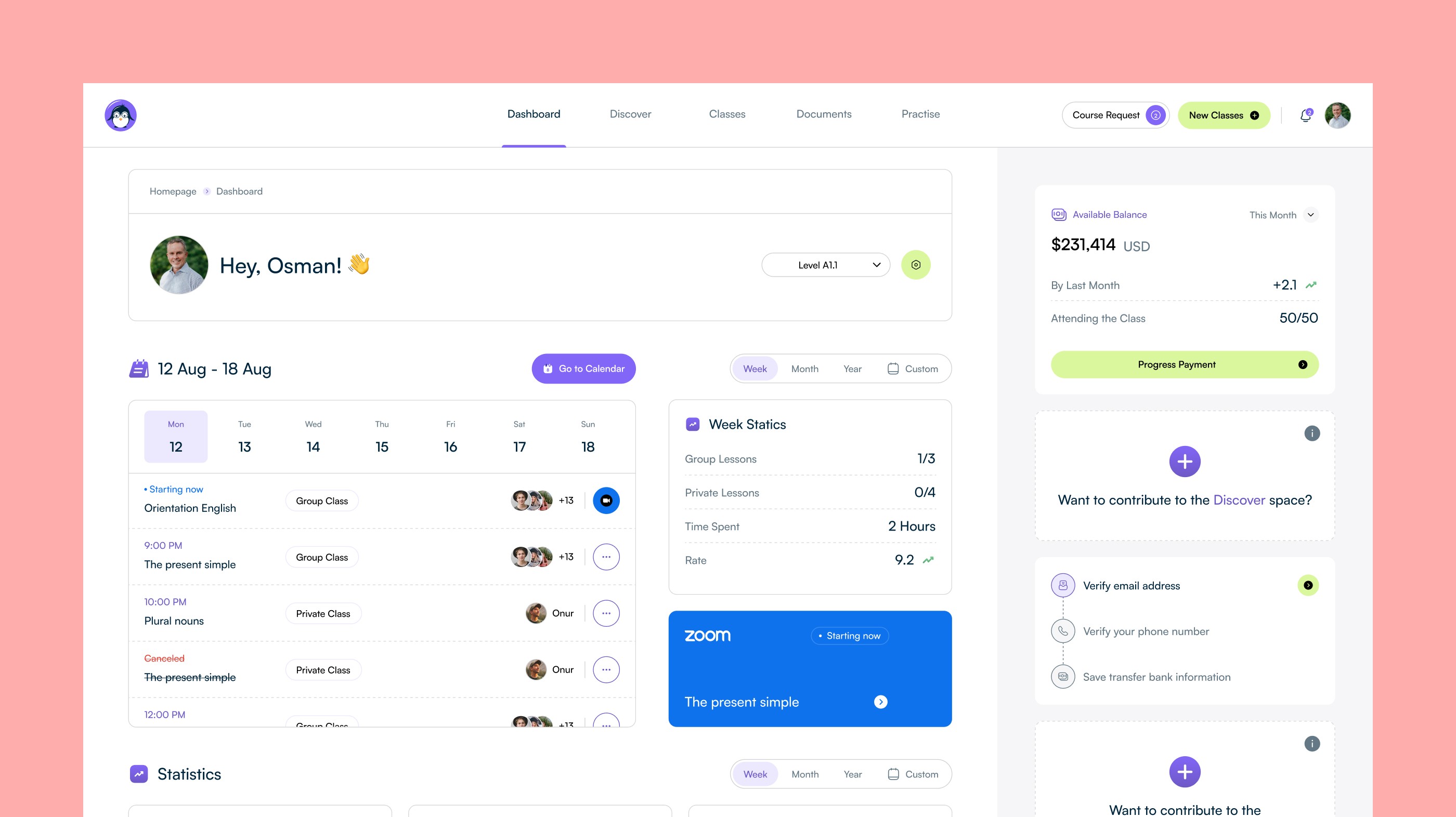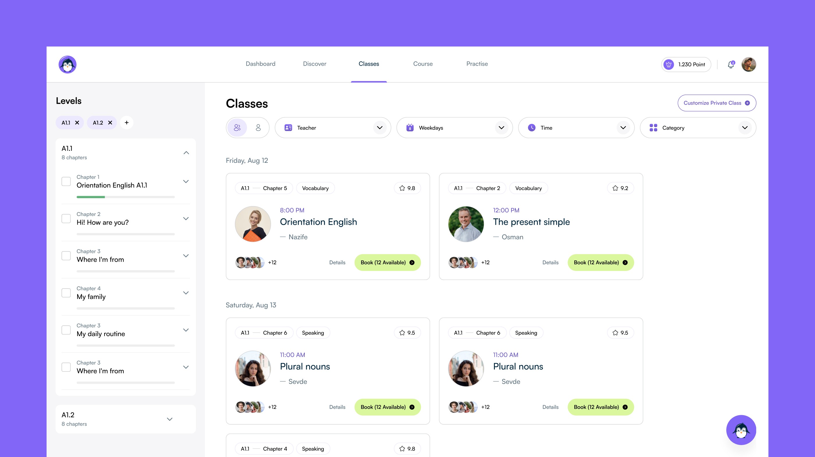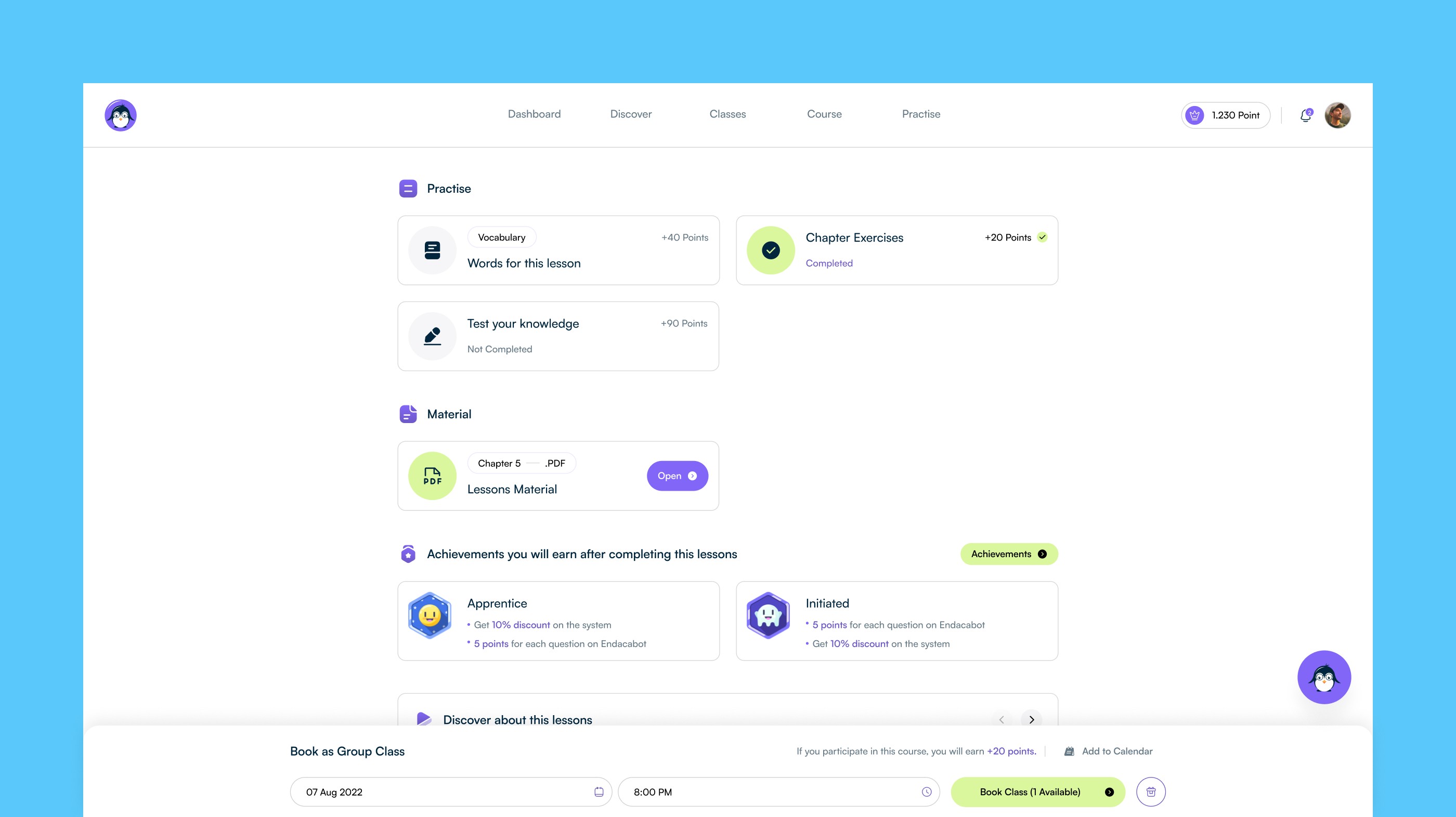 We transformed Endaca’s English learning experience with a user-centric dashboard that tracks progress, allows personalized lesson scheduling with preferred teachers, enables custom class requests for difficult topics, integrates interactive practice tools and reels-style bite-sized content for easier retention, and features a gamified point and level-up system that rewards users with discount codes after each completed and rated lesson.